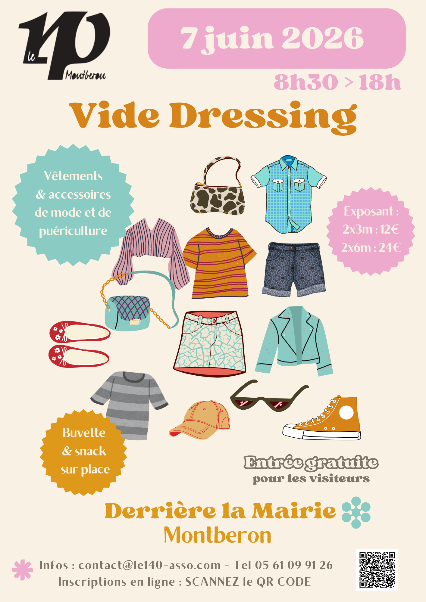 ikrame2026-03-31T14:11:29+02:00Dimanche 7 juin 2026, le 140 vous propose un vide dressing et accessoires de puériculture. Il est temps de faire place nette dans les placards ! Vide Dressing du 140 Montberon Deux tailles d’emplacement disponibles : 2 x 3 mètres linéaires : 12 € 2 x 6 mètres linéaires : 24 € Le vide dressing est ouvert aux particuliers uniquement. L’installation des stands devra se faire de 7h30 à 8h30. Les vêtements devront être suspendus sur des portants avec des cintres, ou pliés en pile sur une table. Les accessoires et chaussures seront exposés sur une table ou au [...]